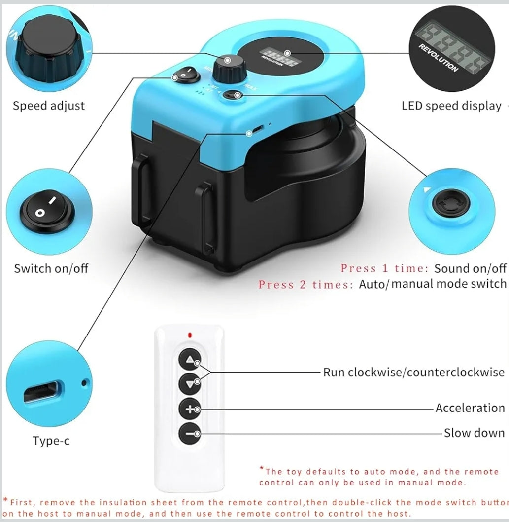 "Very fast, multiple speeds, has alot of attachments for my kittys with a large roll of yarn. best cat toy ever! My fur babies could play with this for hours"